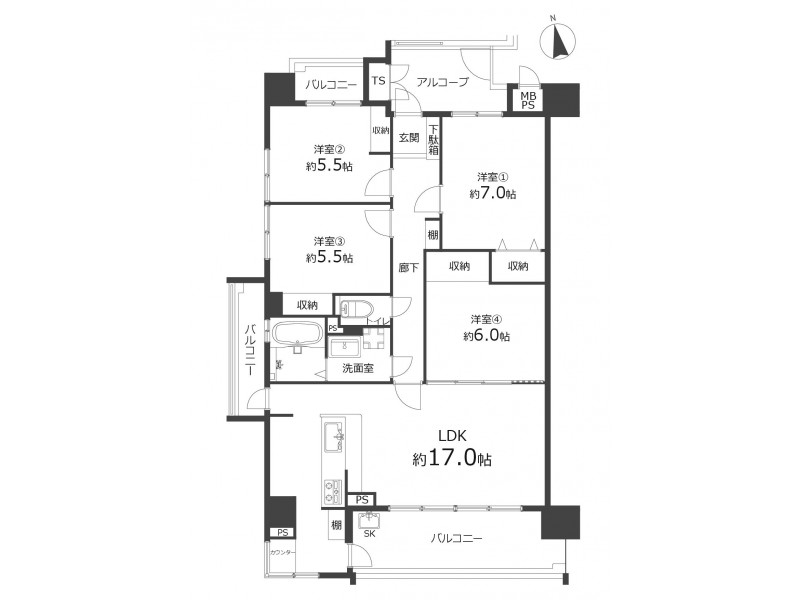 - 洋室: 7.0帖 / 6.0帖 / 5.5帖 / 5.5帖 /
