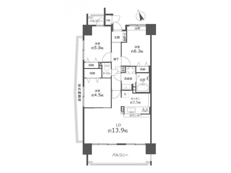 - 洋室: 6.3帖 / 5.8帖 / 4.5帖 /