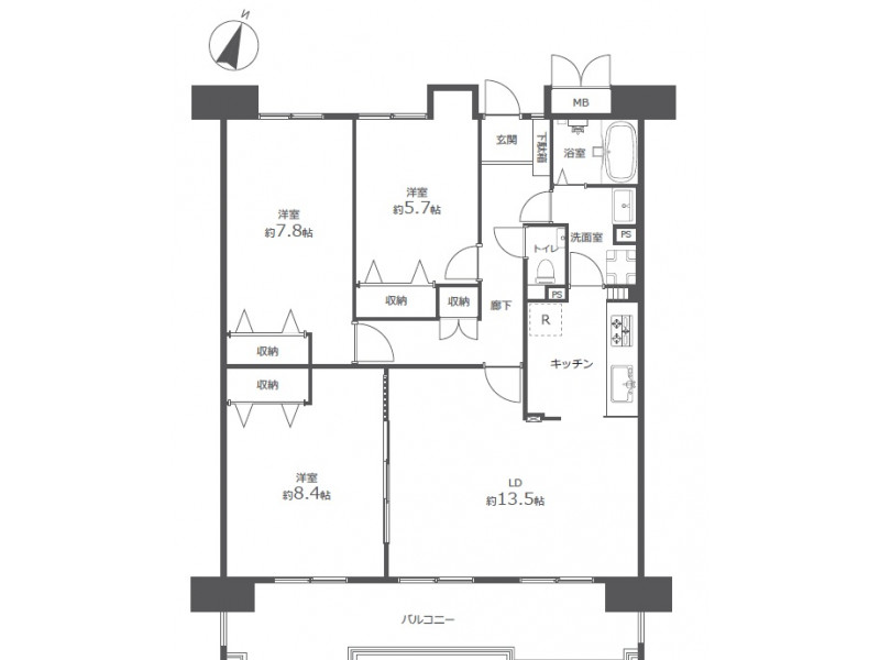 - 洋室: 8.4帖 / 7.8帖 / 5.7帖 /