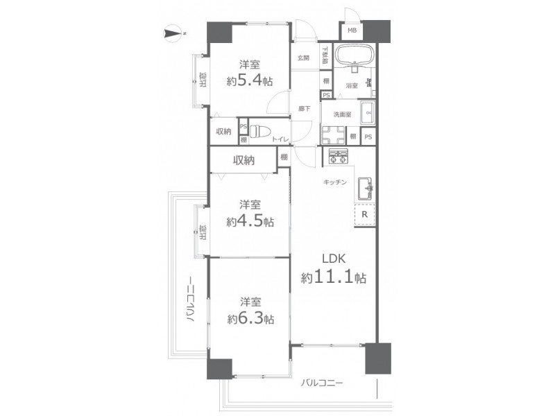 - 洋室: 6.3帖 / 5.4帖 / 4.5帖 /