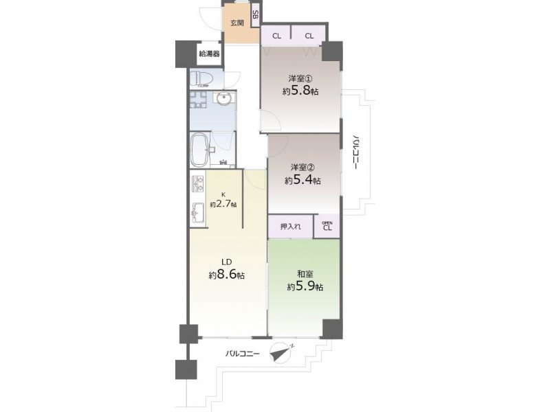 - 洋室: 5.8帖 / 5.4帖 /