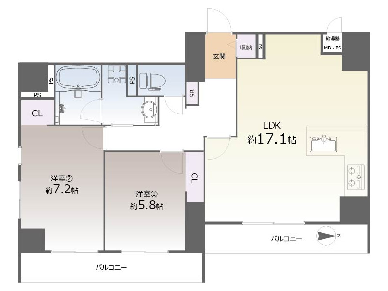 - 洋室: 7.2帖 / 5.8帖 /
