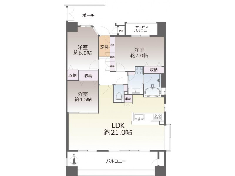 - 洋室: 7.0帖 / 6.0帖 / 4.5帖 /