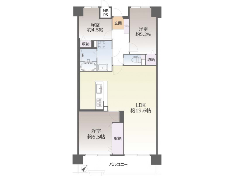 - 洋室: 6.5帖 / 5.2帖 / 4.5帖 /
