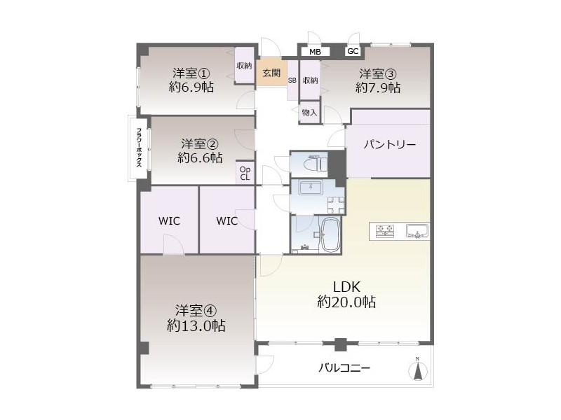 - 洋室: 13.0帖 / 7.9帖 / 6.9帖 / 6.6帖 /