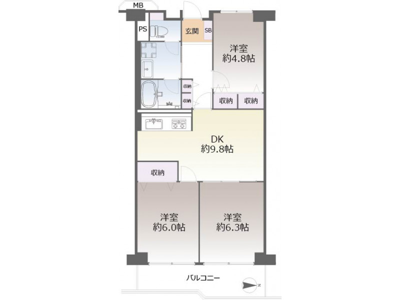 - 洋室: 6.3帖 / 6.0帖 / 4.8帖 /