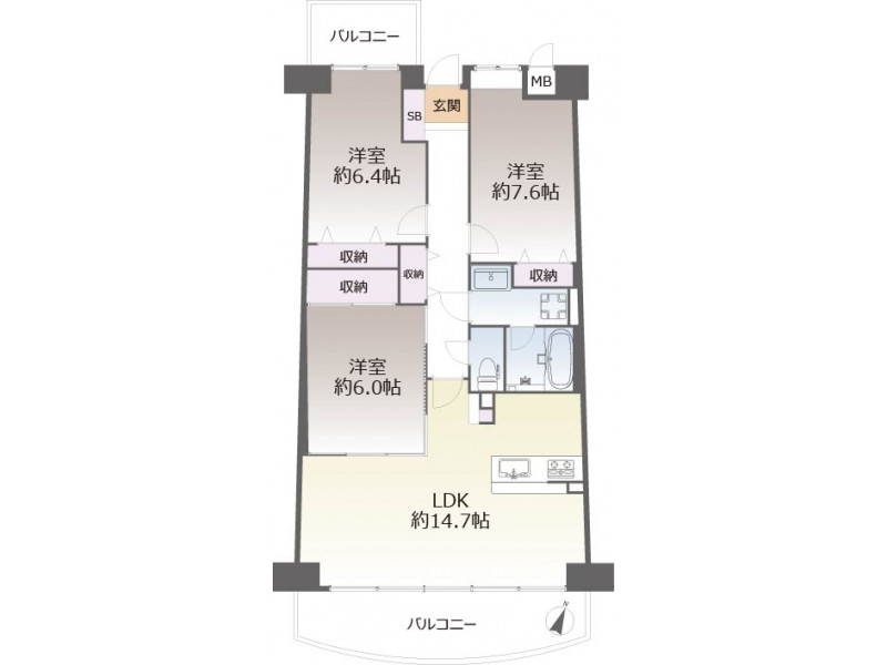 - 洋室: 7.6帖 / 6.4帖 / 6.0帖 /