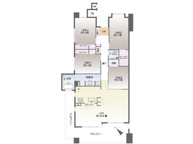 - 洋室: 6.7帖 / 5.8帖 / 5.1帖 / 4.5帖 /