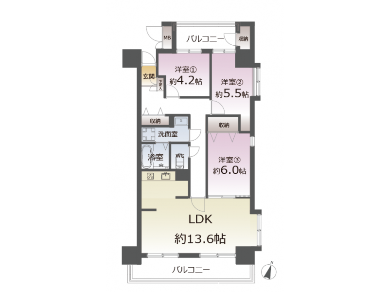 - 洋室: 6.0帖 / 5.5帖 / 4.2帖 /